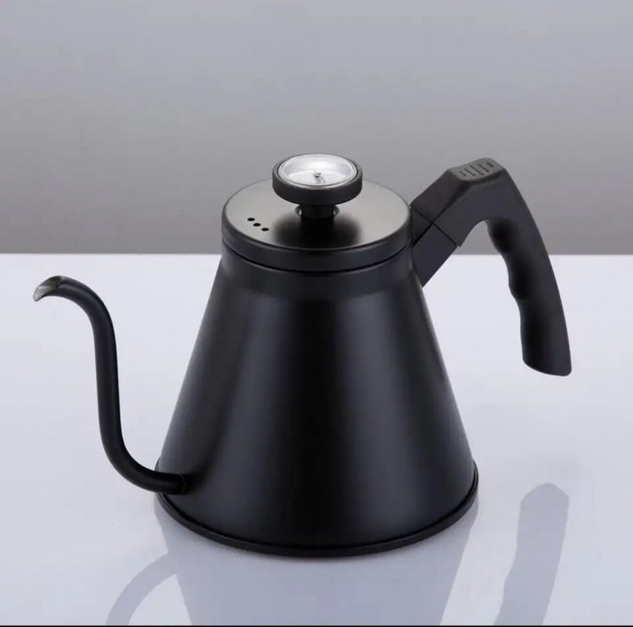 ابريق ترشيح ستيل أسود ، بفوهة طويلة ونحيفة تسمح بالتحكم في سرعة سكب المياه وتوجيهها بدقة،